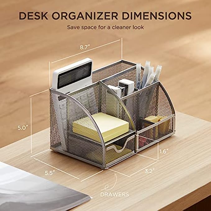 • 【SOPHISTICATED DESKTOP STORAGE】This desk organizer measures 8.7(L) x 5.5(W) x 5(H) inches and weighs 1.37 lbs. Mesh desktop organizer is perfect for dens, desks, dressers and workbenches, use it as a pencil holder, pen holder, desk organizer, makeup organizer or small tool organizer