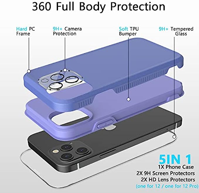 • COMPATIBILITY - Compatible with iphone 12/iphone 12 pro 6.1 inch;You will get:1x phone case,2x tempered screen protectors,1x 12 lens protector,1x 12 pro lens protector.
