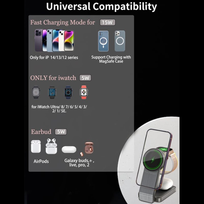 MTech MagTri 3-in-1 Magnetic Wireless Charger for Smartphones, Wireless Earbuds, and Smartwatches