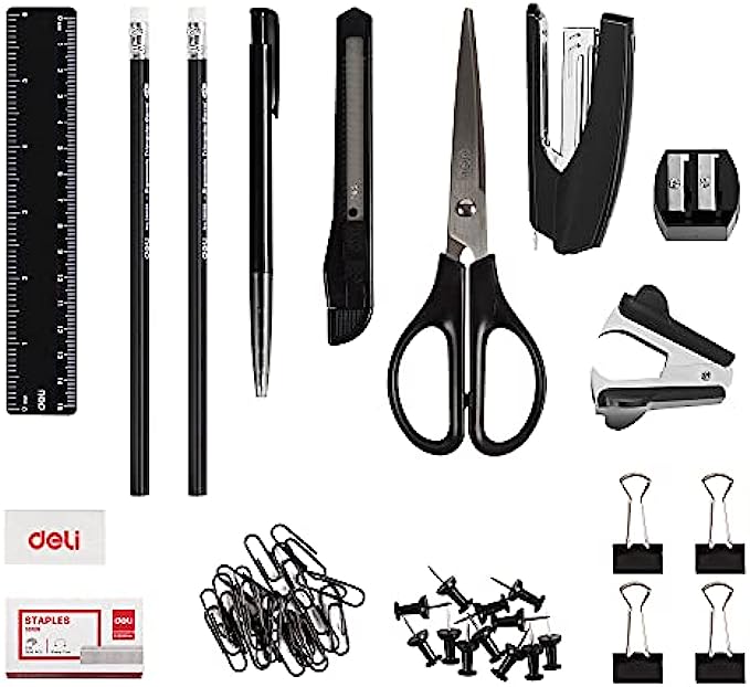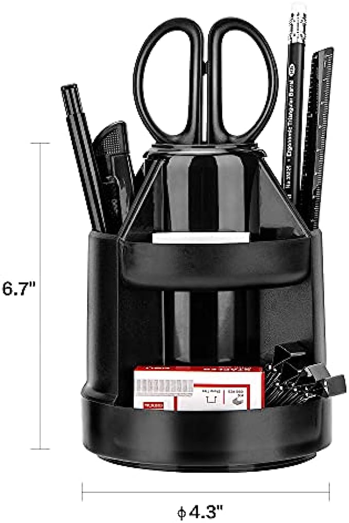 • Comes with:1x Rotating desk organizer, 1x stapler, 1 x staple remover, 1x scissors, 1 x Sharpener, 1 x small cutter, 1 x ruler, 1 x eraser, 1 x ball pens, 2 x HB pencils, 4 x binder clips, 10 x push pins, 20 x paper clips, 1000 x staples.