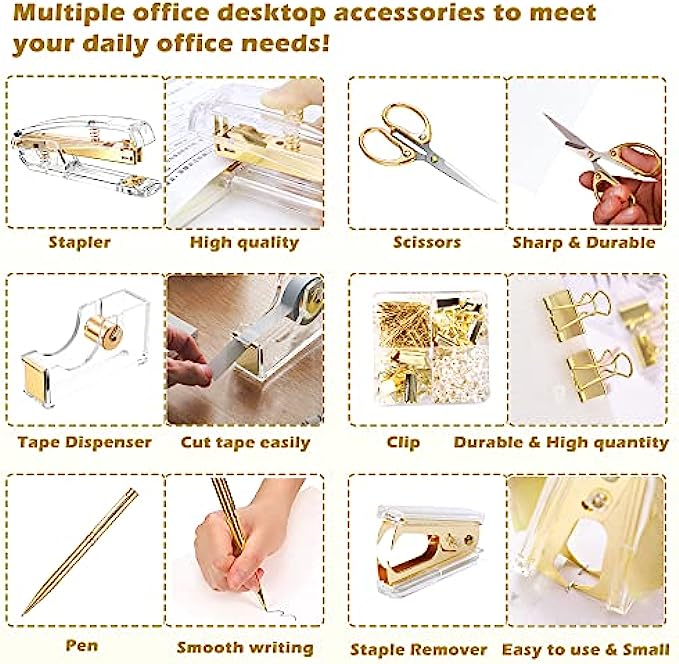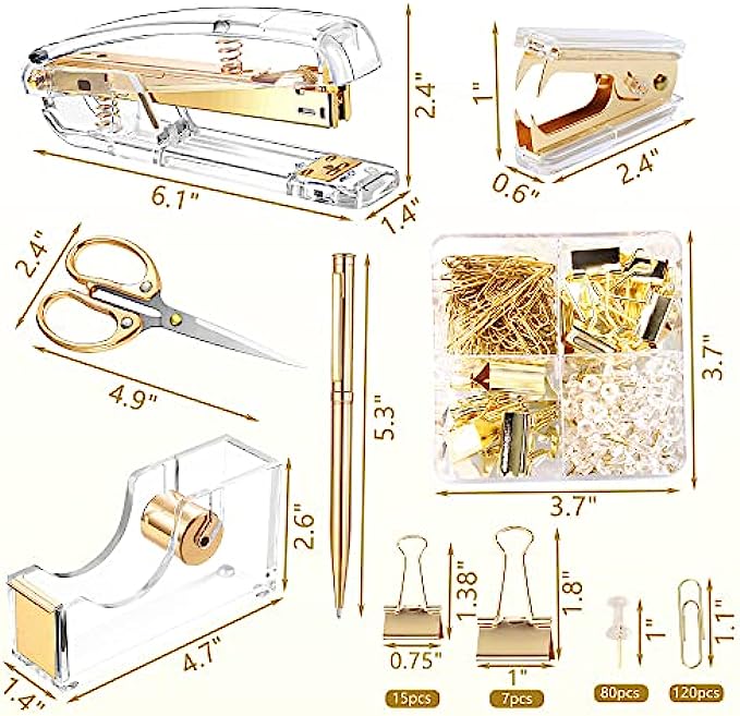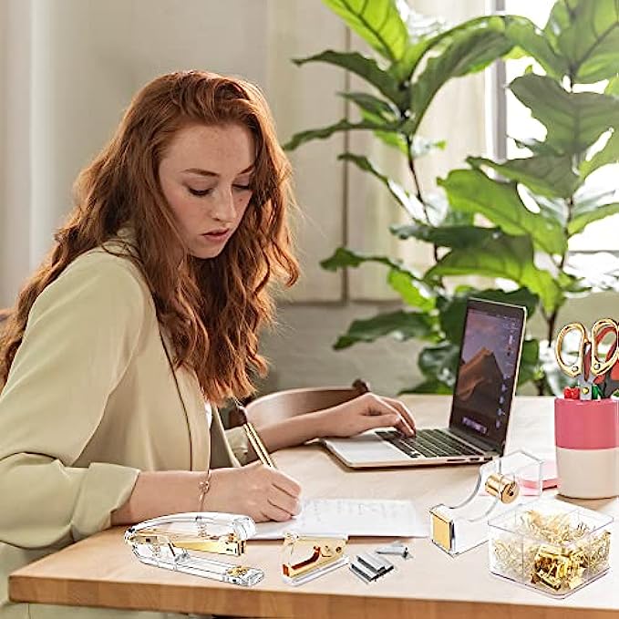 • 【Material】Stapler, Tape Dispenser and Stapler Remover are mainly made of acrylic and metal, smooth and comfortable to the touch, not easy to break, durable. The color is clear and bright, elegant and beautiful, very suitable for desktop office supplies.