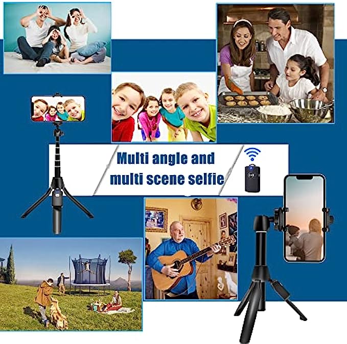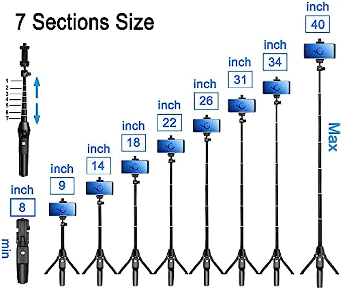 • 【3-In-1 Selfie Stick and Tripod Stand】Selfie stick tripod can be extended between 8.07 to 40 inches, which makes it very suitable for Photograph, Face time, Business, living broadcasting more. It features a fully expandable handheld selfie stick handle with built-in collapsible legs that allow it to double as a stand-alone tripod when opened. You can easily switch between Selfie Stick Mode & Phone Tripod Mode for your preferred use.