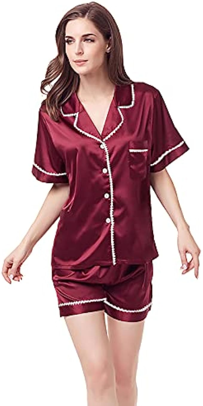 98% Polyester, 2% Other Fibers Button closure Hand Wash Only Material: Pajama set using premium 98% polyester, 2% spandex and plain matte satin material, feel very soft and silky, breathable, skin-friendly, so you have a restful sleep. Product Features: Loose fit, comfortable pajamas two-piece set Loose fit, comfortable two-piece pajama pajamas set with the silkiest elastic waist pants, elegant collar design, chest pockets, and flared buttons with contrast lace piping. The pajama set is soft and elegant, giving you a lazy sleep. Applicable Occasions: Women's short-sleeved silk satin pajama set, suitable for daily wear and easy to match. Light weight and easy to carry. Comfortable, suitable for rest and sleep, slumber party, girls' day, bridal pajamas, indoor, living room, bedroom, hotel, workplace, travel, daily pajamas. Cleaning instructions: The pajamas set is soft, not prevent the surface of the wrinkles affect the beauty, hand wash separately in cold water is recommended. Cool ironing on reverse side. Do not spin dry! Gift: Women's plain matte satin pajamas are made of high quality fabric with nice lace, soft and natural with luster. Perfect for your wife, girlfriend, mother, sister and daughter as a birthday gift, as well as for New Year, Valentine's Day, Christmas, bridal party gifts, honeymoon holidays or other holidays or anniversaries.